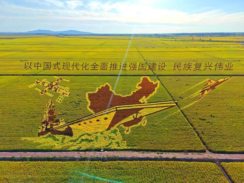 8月27日,黑龙江富锦万亩水稻公园,稻田画展示了我国多项重大科技成果,包括中国空间站、航母等等。赵云南/摄