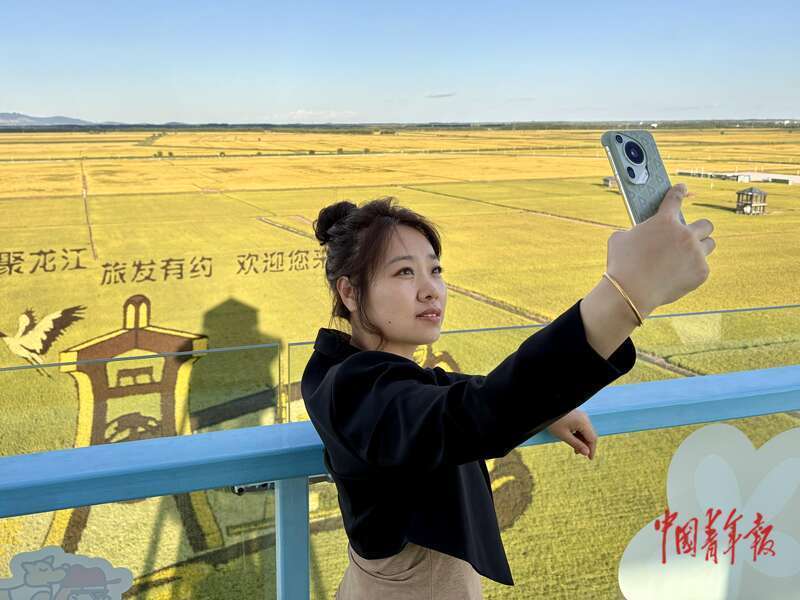 8月27日,黑龙江富锦万亩水稻公园,稻田画已进入最佳观赏期,附近居民及游客纷纷前来打卡。据了解,这里的稻田画每年都会进行调整,融入当年热点元素。中青报·中青网记者 杨雷/摄