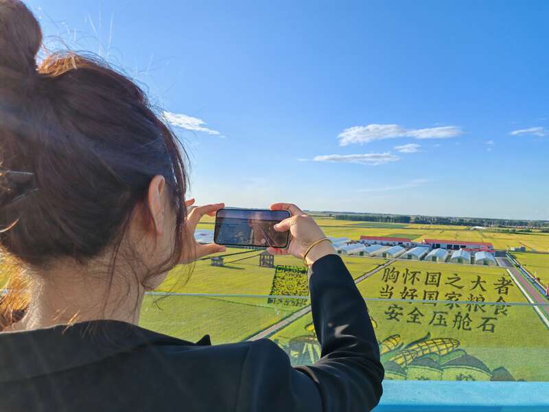 8月27日,黑龙江富锦万亩水稻公园,前来观赏稻田画的人拿起手机留下最美风景。赵云南/摄